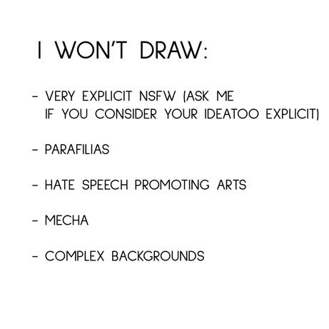 The same with sexual themes. I won't be portraying very explicit fetishises or parafillias however you can ask me to work out how I can meet your needs.